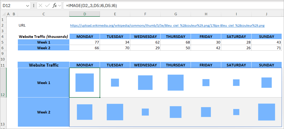 📊 A Cool Chart TrickAt last year's Summit, my Excel MVP friend, Chandoo, shared a great chart trick that I think you'll like! He showed us how we can use the IMAGE function to create a type of chart. Let’s say you’re comparing website traffic on different days. Instead of using plain numbers, you can display images that change size based on the data. It’s a quick way to make your charts stand out. Here’s how to do it: