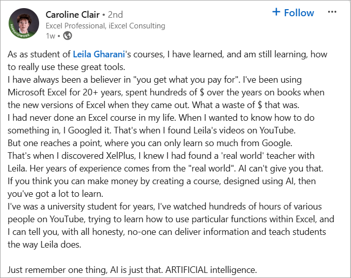 Each method has its perks! If it’s a one-time cleanup, you might not need method 3. And whether you choose 1 or 2, depends a lot on how your data is set up. Take a look, give it a try, and see which one works best for you. 🚀presentaidStruggling to create polished slides fast? Try presentaid – the ultimate PowerPoint and Excel add-in! Presentaid helps you design, align, and style your slides with fewer clicks. No more wasting time on formatting! Its smart library gives you quick access to templates, saving you hours. Best of all, presentaid automates slide creation from your Excel data. Create entire presentations in seconds – with just one click. Ready to streamline your workflow? Sign up for a free trial today and use coupon “Leila1024” to save 40% on your first subscription: https://landing.presentaid.com/leila1024/ Thanks, presentaid, for sponsoring this newsletter! 🤓 Geeky News📁 Copilot and more in OneDriveCopilot in OneDrive for the web is now generally available (if you have the commercial Copilot for Microsoft 365 license). It allows you to summarize the contents without opening the file. Or compare up to 5 files to find differences. You can also create custom Copilot Agents to coordinate the documents for different projects. This latest OneDrive update also promises an enhanced search experience. You can easily filter search results by file type, time scope, and library. Another feature that was already available in OneDrive Web is now coming to OneDrive in Windows File Explorer. You can color-code your folders for easy identification. We just got this feature. I love this one! It makes it so much easier to spot the important folders. Just right-click on the folder and go to OneDrive > Folder color. BTW, if you're a masochist, check out this (probably AI-generated) song about OneDrive. I guess it was trying to emulate Hamilton. Microsoft, please don't. We'll take the colorful folders and easy file comparison, but please don't try to do music. 🙉🙊🙈 📊 New List Slicer in Power BIThe October release of Power BI Desktop comes with a new visual - the List Slicer. It's part of an ongoing effort to revamp the core visuals. We've already had the new card and new button slicer. The List Slicer is still in the early stages but it already offers more customization options than the standard slicer. You can change how items are selected, adjust the shape and layout. You can modify the look in each state (selected, unselected, on hover). This gives you much more leeway in your design. There's more to come in future updates, like image support, labels and conditional formatting. To test it out, go to Options > Preview features and enable List slicer visual. 🤖 Quick measure suggestion only with Copilot in Power BIMicrosoft giveth, Microsoft taketh away. In the same release, Power BI is ending Quick measure suggestions. It was a preview feature that used AI to write DAX measures based on natural language prompts. It's replaced with Microsoft Fabric Copilot which is only available in the Premium or Fabric capacity. If you have a free, Pro or Premium per User account, you can still use quick measures - the old way. By populating the pre-built template with your fields. 👏 Power StoriesI came across this wonderful post on LinkedIn. I love hearing stories like this. They remind me that we've all been there. Endless Googling to find the right Excel tips... and feeling stuck, when all you want is a quick, clear solution. Caroline’s journey shows that with the right guidance, everything clicks into place. If you’ve ever felt the same way, just know that it doesn’t have to be so hard. We’ve designed our courses to help you skip the struggle and get straight to the point. Whether you’re looking to save time or finally feel confident with Excel, we’ve got you covered. And if you’re ready to take that next step, I’d love to have you join us! See you next week, Leila Want more?▶️ Subscribe on YouTube 🖇️ Follow us on LinkedIn 🥇 Join 400,000+ students in our courses 📣 Want to sponsor Between the Sheets? Get in touch here. 📨 If you were forwarded this message, you can get the free weekly email here. This newsletter contains affiliate links, which give us a small commission on any purchase made at no cost to you. This helps us run Between the Sheets and bring you updates like this. Thank you for your support! |