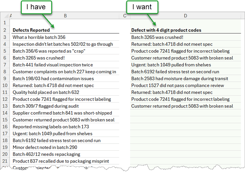 You have a list of messy text. You need to filter it down to only rows that contain a 4-digit product code. Me in 2004 would have done it manually. Me in 2014 would have used VBA. Me now? Just 60 seconds with one formula. The function is called REGEXTEST. It's relatively new in Excel, and once you see what it does, you'll wonder how you worked without it. 👉 Check out the short video here REGEXTEST tells you if a pattern exists. But there are two sister functions also worth knowing:...