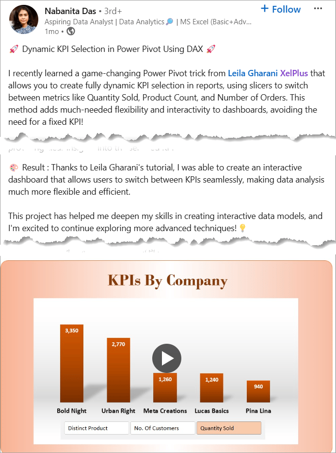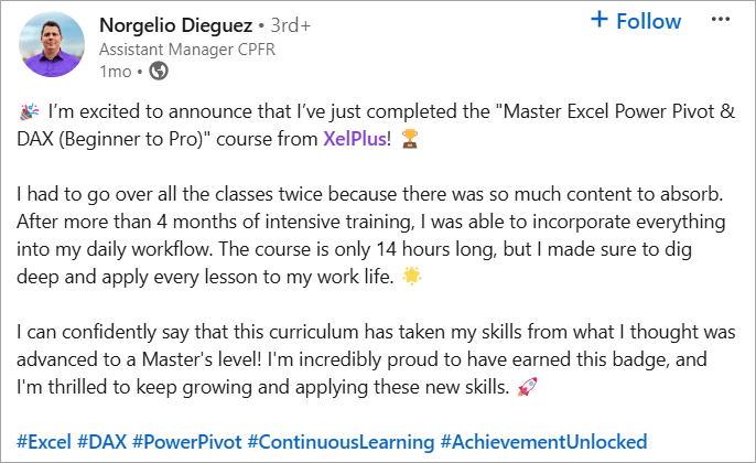 👏 Power StoriesBig shoutout to Norgelio! 🎉 Your dedication to mastering Excel Power Pivot & DAX is inspiring! Going through the course twice and applying everything at work shows serious commitment. That's how you make sure those skills stick. Congratulations on your well-deserved success! Excited to see where your new skills take you next. Do you have a success story using your XelPlus skills? I’d love to hear it! Just hit reply to share, and your journey could be the inspiration other students need. 😇 See you next week, Leila Want more?▶️ Subscribe on YouTube 🖇️ Follow us on LinkedIn 🥇 Join 400,000+ students in our courses 📣 Want to sponsor Between the Sheets? Get in touch here. 📨 If you were forwarded this message, you can get the free weekly email here. This newsletter contains affiliate links, which give us a small commission on any purchase made at no cost to you. This helps us run Between the Sheets and bring you updates like this. Thank you for your support! |