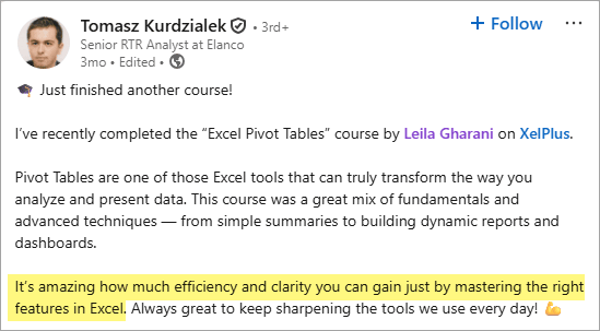 Takes 5 minutes to set up. Then you've got it for every quarterly review, budget meeting, or "quick analysis" your boss asks for at 4:30 PM on a Friday. π Read the full guide hereβ Download the practice workbook and try it yourself. Next time someone asks for year-over-year anything, you'll have it ready. β β π€ Geeky Newsπ Excel's new shortcut for importing dataForget Power Query? I wouldn't go that far π But Excel just got new functions that make simple data imports faster. IMPORTTEXT and IMPORTCSV pull data directly into the grid as a dynamic array. No Power Query UI needed. Just type the formula, point to your file (local or URL), and the data loads. Hit refresh when you need it updated. IMPORTCSV is the simpler version with built-in defaults. IMPORTTEXT gives you more control over delimiters, encoding, and row filtering. Both work with the =COPILOT function if you want to ask questions about your imported data. Rolling out to Insiders in the Beta channel. π Word finally catches up on hyperlinksYou can now paste a URL directly onto highlighted text in Word, and it automatically creates a hyperlink. No more right-click, insert hyperlink, paste, OK. Just highlight and paste. This already works in Teams and Loop. I'd like to see it in Outlook next. π File Explorer getting more upgradesβCopilot might soon live inside File Explorer instead of just popping out as a separate app. Microsoft is testing a "Chat with Copilot" sidebar that stays docked in Explorer (you can detach it if you want). Right now, the right-click Copilot button just launches a separate window. This would keep everything in one place. Also, File Explorer search is getting a memory diet. The idea is to eliminate duplicate file indexing operations, which means less RAM usage when you're searching for files. Faster searches, fewer background tasks eating up resources. Both features are currently in Windows Insider builds. No word yet on when they'll roll out to everyone. β π€ Did You Know?What if you need to calculate year-over-year (or month-over-month) change in a pivot table? No formula here. Instead, you'll use "Show Values As" > "% Difference From". π₯ Just like I show here. Works on data in columns too. It's the base field that matters - and the sort order. With this setup: you'll want to use "% Difference From (next)". β π The tools you use everyCongrats to Tomasz on completing Pivot Table Mastery π and sharing this: Pivot Tables are that tool you know exists but never quite learn properly. Then you actually learn them. And suddenly that hour-long data summarizing task takes five minutes. Reports that needed constant updating just... refresh themselves. If Pivot Tables are still on your "someday" list, that's what this course fixes. See you next week, Leila β When you're ready, here are some ways we can help: π Join 400,000+ members in our coursesβ πΊ Get free tutorials on YouTubeβ π₯ Train your whole team with our courses. Team pricing and progress tracking - reply for details. This newsletter contains affiliate links, which give us a small commission at no cost to you. Thank you for your support! |