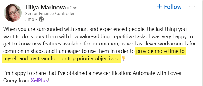 Note: "All merging conditional formats" pastes the cell contents along with the conditional formatting rules. Unlike Paste Formats, it doesn't overwrite any conditional formatting rules already in the destination cell. β π More Time for What Actually MattersWhen you work with smart people, the last thing you want is to bury them in repetitive tasks. Liliya gets it. She's a Senior Finance Controller. Her team is talented. And now they're spending less time on low-value work and more time on what actually moves the needle: That's the real win. Congrats on earning the Automate Excel certificate! π β See you next week, Leila β Want more?βΆοΈ Subscribe on YouTube ποΈ Follow us on LinkedIn π₯ Join 400,000+ students in our courses π£ Want to sponsor Between the Sheets? Get in touch here. π¨ If you were forwarded this message, you can get the free weekly email here. This newsletter contains affiliate links, which give us a small commission on any purchase made at no cost to you. This helps us run Between the Sheets and bring you updates like this. Thank you for your support! |